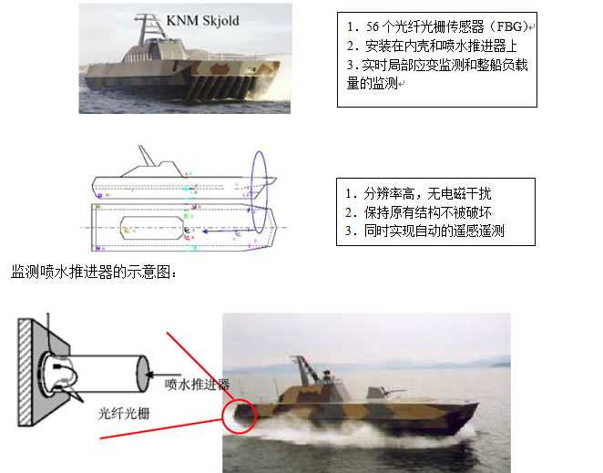 1999年春,美國(guó)海軍研究實(shí)驗(yàn)室(Naval Research Laboratory, NRL)光纖靈巧結(jié)構(gòu)部的Michael Todd等人用光纖傳感系統(tǒng)對(duì)KNM Skjold 快速巡邏艇進(jìn)行智能監(jiān)測(cè)。