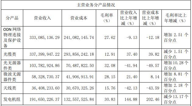 分產(chǎn)品來看,ODN網(wǎng)絡(luò)物理連接及保護設(shè)備營收約3.33億元,同比下降9.13%,毛利率27.62%;光纜類營收約3.37億元,同比增長37.40%,毛利率為12.91%;光無源器件類營收約1.04億元,同比下降41.94%,毛利率32.08%。微波無源器件類營收約5832.9萬元,同比增長21.40%,毛利率28.15%;天線類3640.8萬元,同比下降42.13%,毛利率15.76%。;發(fā)電機組營收約1.92億元,同比增長144.88%,毛利率30.83%。