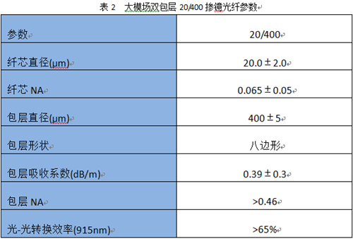 長飛公司經(jīng)過五年的技術(shù)積淀、平臺打造和產(chǎn)品系列化研發(fā),已逐步推出了定位于低功率光纖激光器的125μm系列大模場雙包層摻鐿光纖和定位于中高功率光纖激光器的20/400系列雙包層摻鐿光纖。