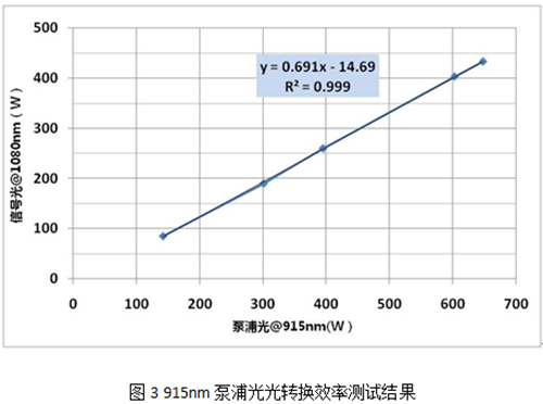 如圖2所示,915nm的泵浦光耦合,使用1080nm的高低反光柵進(jìn)行測試,長飛公司大模場雙包層20/400摻鐿光纖的光光轉(zhuǎn)換效率達(dá)到67%,同時隨著泵浦功率的增加,光光效率呈現(xiàn)出增加的現(xiàn)象。(見圖3測試結(jié)果)