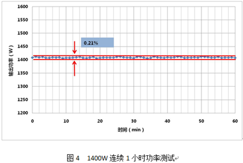 為驗證長飛20/400光纖更高功率的穩(wěn)定性,測試人員增加了一組1400W的穩(wěn)定性測試實驗。測試結(jié)果顯示,長飛20/400光纖1小時內(nèi)功率波動值在0.21%,如圖4。