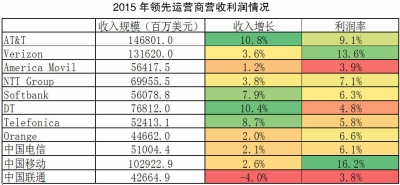 ICCSZ訊 2015年全球經(jīng)濟(jì)繼續(xù)以溫和態(tài)勢(shì)增長(zhǎng),縱觀全球領(lǐng)先運(yùn)營(yíng)商財(cái)務(wù)狀況,大部分業(yè)績(jī)繼續(xù)穩(wěn)定回暖,盡管基礎(chǔ)服務(wù)收入增速下滑已成定勢(shì),但各企業(yè)將尋求收入增長(zhǎng)放在首位,通過多元布局拉動(dòng)規(guī)模增長(zhǎng)。美國(guó)運(yùn)營(yíng)商AT&T和Verizon通過擴(kuò)張布局和削減成本,收入利潤(rùn)維持較好水平,發(fā)展處于第一梯隊(duì);歐日中大部分企業(yè)根據(jù)自身特色選擇性發(fā)展業(yè)務(wù)各有千秋,處于第二梯隊(duì);美洲電信和中國(guó)聯(lián)通在市場(chǎng)競(jìng)爭(zhēng)激烈的環(huán)境下未能及時(shí)調(diào)整戰(zhàn)略步伐,營(yíng)收利潤(rùn)均發(fā)展不佳,處于第三梯隊(duì)。