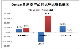 另外OPENXT三季度財報反應40G和100G產(chǎn)品收入增長迅速,環(huán)比增長35.9%。Opnext三季度總銷售收入環(huán)比增長9.5%,同比增長6.7%。來自40Gbps及以上速率產(chǎn)品的收入環(huán)比增長35.9%,增長主要來自40Gbps和100Gbps模塊。來自10Gbps及以下速率的產(chǎn)品收入環(huán)比微幅增長1.2%,其中增長主要來自XFP模塊,同比增長13.2%。而40Gbps子系統(tǒng)銷售收入環(huán)比持平,同比則下降20.7%,下降主要是由于40Gbps子系統(tǒng)銷量下滑。