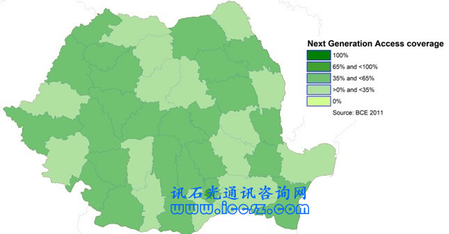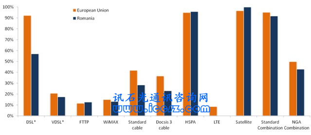 《2011歐洲寬帶覆蓋》調(diào)研報(bào)告顯示,羅馬尼亞基本寬帶覆蓋率(至少提供144kbps的服務(wù),只要他們?cè)敢猓┻_(dá)92%,超高速寬帶(也稱為NGA,即下一代接入)覆蓋接近43%。在調(diào)研的29個(gè)國(guó)家中(歐盟27國(guó)和挪威、冰島),96%能夠獲得基本寬帶,超過50%(一半國(guó)家走向2020數(shù)字天堂目標(biāo))能夠獲得超高速。