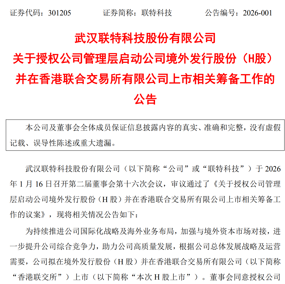 ICC訊 1月16日,武漢聯(lián)特科技股份有限公司(簡(jiǎn)稱(chēng)聯(lián)特科技)發(fā)布公告,聯(lián)特科技董事會(huì)啟動(dòng)公司境外發(fā)行股份(H股)并在香港聯(lián)合交易所有限公司上市相關(guān)籌備工作。