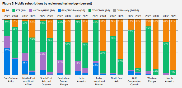 最新的愛(ài)立信移動(dòng)報(bào)告還顯示,北美地區(qū)5G用戶的增長(zhǎng)勢(shì)頭強(qiáng)于此前的預(yù)測(cè)。到2022年底,該地區(qū)的5G全球用戶滲透率最高,為41%。
