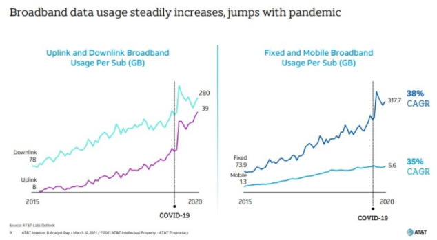 AT&T正尋求擴大光纖覆蓋范圍。在疫情期間,數(shù)據(jù)需求和網(wǎng)絡使用量不斷上升,并且預計短期內不會停止。AT&T的數(shù)據(jù)顯示,疫情期間,上下游帶寬數(shù)據(jù)需求大幅上升,其中固定網(wǎng)絡的增長尤為明顯,單用戶的月使用量上升到了317.7G。