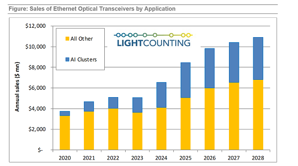 下圖顯示了LC對以太網(wǎng)光收發(fā)器銷售的預(yù)測,其中包括對AI集群光連接對該市場的貢獻(xiàn)的估計。未來5年,用于AI集群應(yīng)用的光收發(fā)器的總銷售額將達(dá)到176億美元,相比同期所有其他應(yīng)用以太網(wǎng)收發(fā)器285億美元的收入,這確實是一個非常大的數(shù)字。