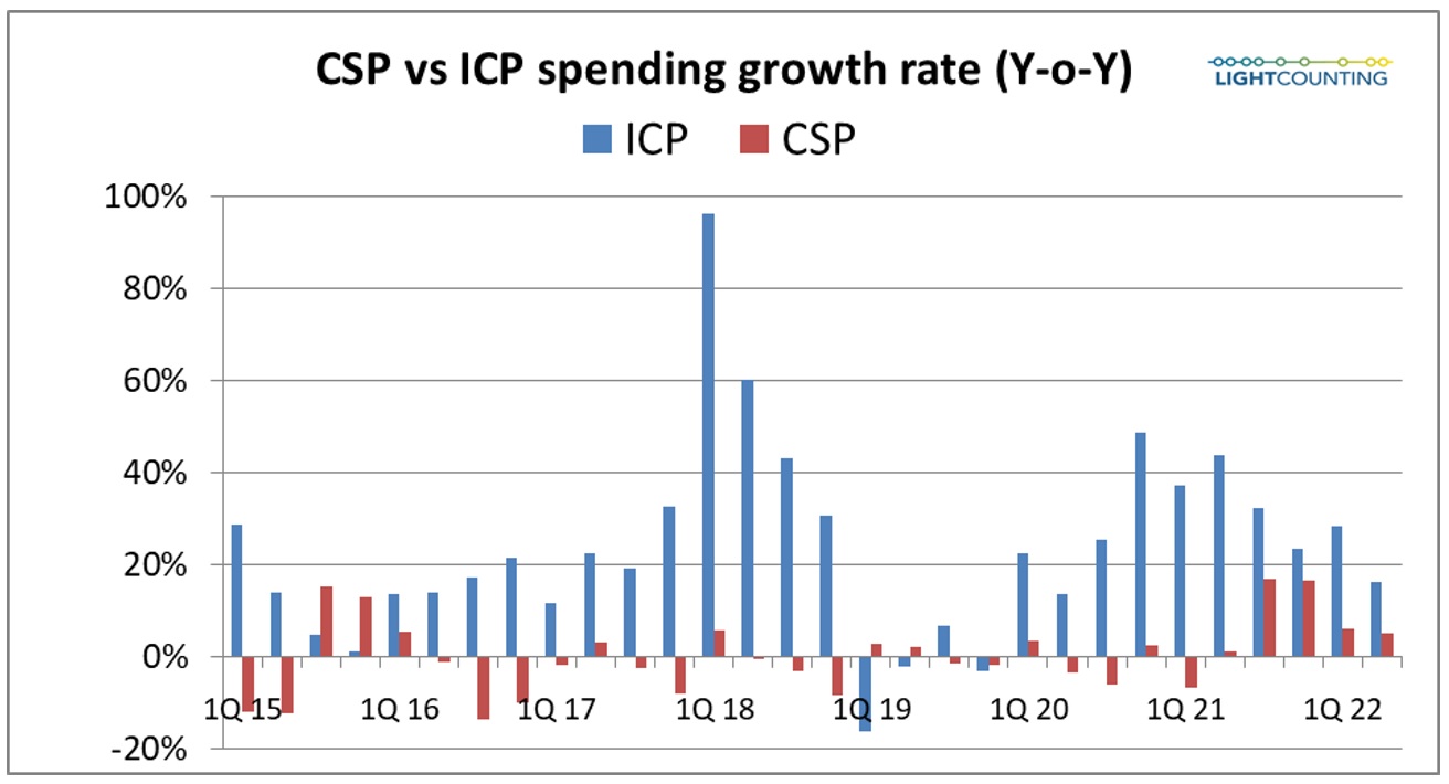CSP(通信服務(wù)提供商)和ICP都報告了與2021年同一季度相比資本支出的增加。然而,在過去的幾個季度里,這兩大陣營的資本支出增長率一直在放緩,如下圖所示,今年第三季度和第四季度的資本支出持平或為負數(shù)并不令人驚訝。