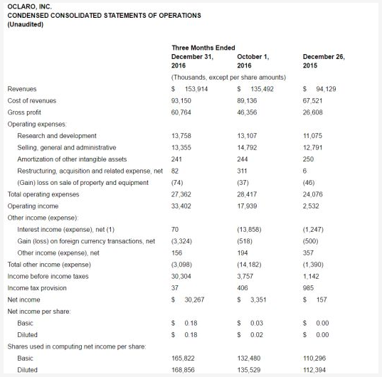 Oclaro公司Q217主要財(cái)務(wù)數(shù)據(jù)(一)