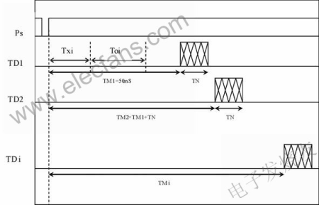 圖2描述了進行數(shù)據(jù)通信的時序關(guān)系,當光接收器輸出信號出現(xiàn)下降沿(即Ps=0)時,表示接收到主機的信號,上升沿到來時開始計時,而且以后的數(shù)據(jù)傳送也是以這個上升沿為參照標準。測量時間Txi +T0i 和Txj+T0j不大于40ms。對于第一個測量部件在同步信號啟動測量以后再延時TM1≥Txi +T0i就可以傳送數(shù)據(jù)了。為了可靠,本設(shè)計取TM1=50ms作為測量過程的延遲時間。設(shè)每次傳送數(shù)據(jù)的時間為TN,那么第二個測量部件傳送數(shù)據(jù)的延時就是第一個延遲時間加上TN,即:TM2= TM1+TN,后面的延時TM的計算依次類推。