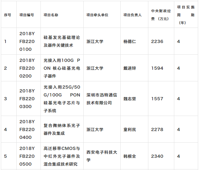 國家重點(diǎn)研發(fā)計(jì)劃“光電子與微電子器件及集成”重點(diǎn)專項(xiàng)2018年度擬立項(xiàng)項(xiàng)目公示清單