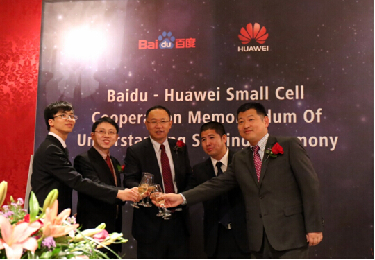 華為無(wú)線網(wǎng)絡(luò)總裁汪濤(左三)、華為smallCell產(chǎn)品線總裁周躍峰(右一)和百度LBS合作總監(jiān)蘇廣富(右二)共同出席簽約儀式