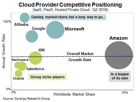 微軟、谷歌和阿里巴巴的收入增速遠(yuǎn)超整體市場,因此三者市場份額均實現(xiàn)增長;不過市場領(lǐng)導(dǎo)者亞馬遜仍保持其主導(dǎo)地位,并且市場份額上升了一個百分點(diǎn)至34%,規(guī)模大于其后四大競爭者的總和。