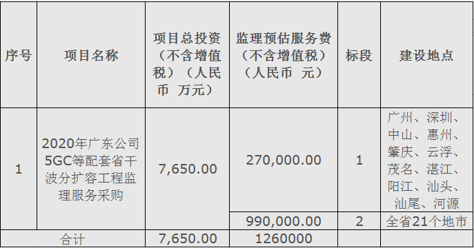 ICC訊(編輯:Anton)中國(guó)電信股份有限公司廣東分公司發(fā)布公告,招標(biāo)2020年廣東公司5GC等配套省干波分?jǐn)U容工程監(jiān)理服務(wù)采購(gòu)(標(biāo)段一、二)。本項(xiàng)目劃分為2個(gè)標(biāo)段,標(biāo)段一最高投標(biāo)限價(jià)270000元,標(biāo)段二最高投標(biāo)限價(jià)990000元。