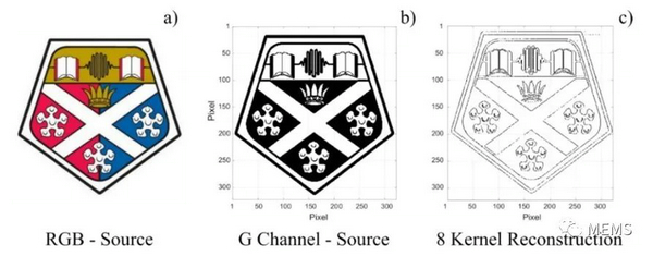 為了進(jìn)一步測試該系統(tǒng)的能力,研究人員選擇了一幅更復(fù)雜的源圖像,即思克萊德大學(xué)(UoS)的323? × 323?像素RGB圖像。結(jié)果表明,所有水平線、垂直線和對(duì)角線均被識(shí)別,進(jìn)一步說明圖像大小和復(fù)雜性均不會(huì)妨礙基于光子脈沖VCSEL的邊緣檢測系統(tǒng)的操作。重要的是,實(shí)現(xiàn)了96.63%的整體邊緣檢測精度。我們必須注意,每個(gè)像素的時(shí)間可以進(jìn)一步減少到僅1ns(VCSEL神經(jīng)元的脈沖耐受時(shí)間),而無需任何額外的優(yōu)化過程,以實(shí)現(xiàn)更快的處理速度。