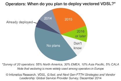 ICCSZ訊(編譯:Nina)Infonetics調(diào)查顯示,計劃為住宅用戶提供1G帶寬速度的服務(wù)供應(yīng)商將從2015年的15%上升至2017年的40%。受訪者的用戶中66%使用銅線接入技術(shù),35%使用光纖接入技術(shù),今年光進銅退將更進一步??紤]到部署的成本,一半受訪者還沒有計劃部署或不確定是否會部署FTTdp或G.fast技術(shù)。受訪的運營商認為阿爾卡特朗訊是領(lǐng)先的DSL設(shè)備制造商,同時阿爾卡特朗訊和Calix(并列)是領(lǐng)先的FTTH設(shè)備制造商。