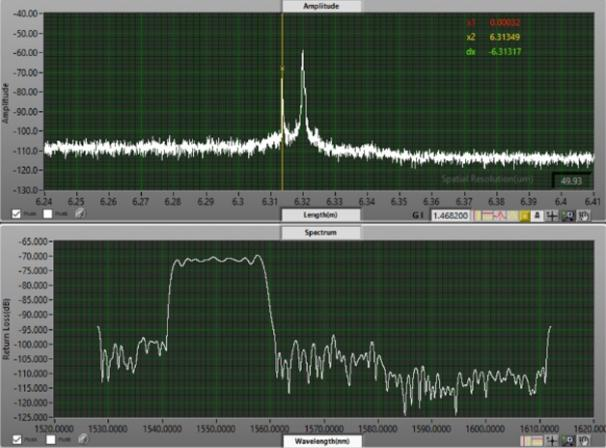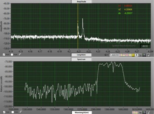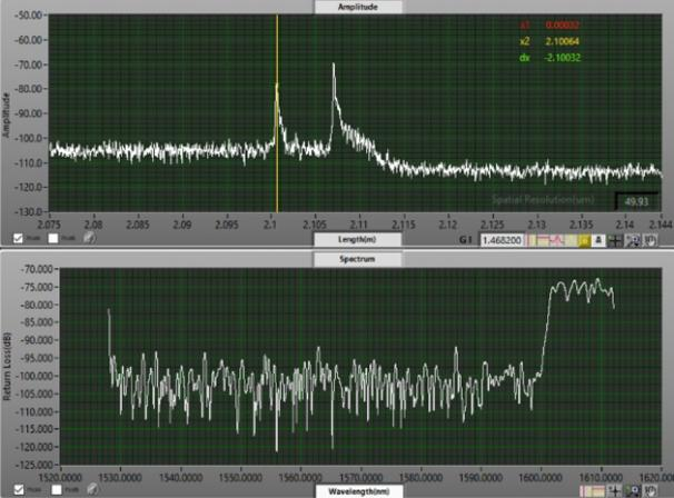 從圖3(a)中可以看出,光譜信息可以看到1528~1612nm范圍內(nèi)的信息,回波損耗曲線上2.10032m處的反射峰回波強(qiáng)度約為-75dB,其光譜信息上1600~1612nm的波段回?fù)p強(qiáng)度約為-75dB,而Pass通道允許通過的波長范圍為1600~1620nm,說明2.10032處為Pass通道的反射峰,同理從圖3(b)中可以看出2.10670m處為Reflect通道反射峰。