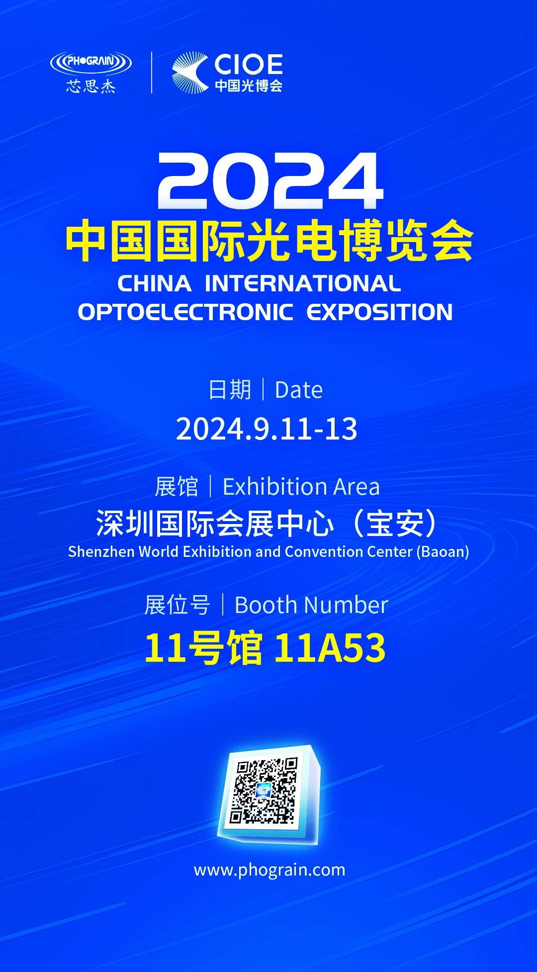 The 25th China International Optoelectronic Exposition (CIOE 2024) will be held at the Shenzhen International Convention and Exhibition Center (Baoan) from September 11-13, 2024. As a leading global supplier of photodetector chips, PHOGRAIN will showcase its 1.6T AI computing power photodetector chips, access/vehicle/drone/intelligent terminal/sensor solutions at CIOE. We look forward to meeting you at booth 11A53 in Hall 11.