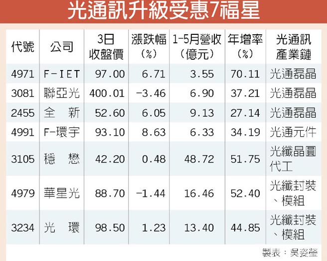 受惠光通訊需求爆發(fā)的公司,從上游聯(lián)亞光(3081)、F-IET(4971)、中段F-環(huán)宇(4991)、穩(wěn)懋(3105)、下游光環(huán)(3234)、華星光(4979)等公司,前5月累積營收有高達70.11%~34.19%的年增率,表現(xiàn)優(yōu)異。
