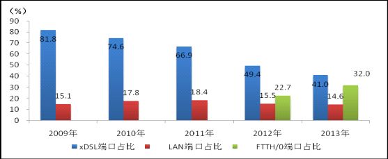 圖 2009-2013年互聯(lián)網(wǎng)寬帶接入端口按技術類型占比情況