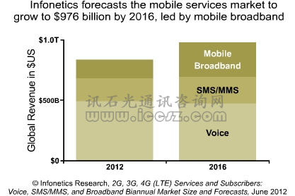 全球移動(dòng)服務(wù)市場(chǎng)預(yù)計(jì)在2016年增長到9760億美元,大部分的增長將來自移動(dòng)寬帶服務(wù)。