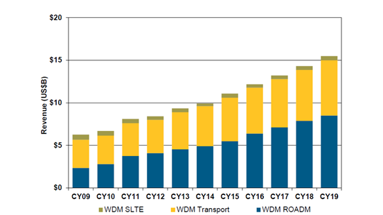 ICCSZ訊 根據(jù)著名的市場研究機(jī)構(gòu)IHS Infonetics的最新報告顯示,在光傳輸市場,除了100G仍然保持快速增長外,ROADM成為另外一顆市場明星。2015年第二季度中,ROADM市場收入在整個WDM市場收入中的比例高達(dá)45%。該報告預(yù)測,ROADM的市場2015年收入同比2104年將增長12%,而且到2019年,該市場的復(fù)合增長率也高達(dá)12%,這大大超過了整個WDM市場9%的年復(fù)合增長率,成為未來4年間WDM細(xì)分市場中增長最快的部分。