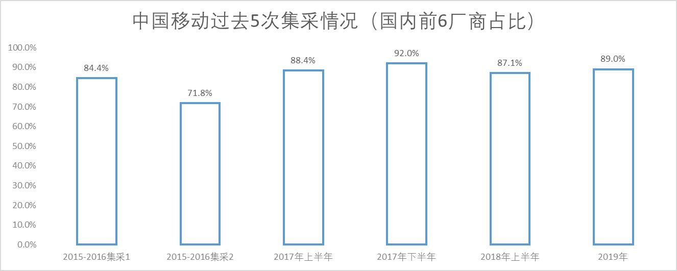 以中國移動為例,作為國內(nèi)最大的電信運營商,其招標集采量幾乎占了國內(nèi)需求的2/3,因此分析中國移動過去幾期的光纜集采,對分析整個光纖光纜行業(yè)具備很強的借鑒意義。下圖能夠清晰的看到,從2015年的集采開始,前六大廠商的份額一直波動在80%-92%(其中有一期集采通鼎互聯(lián)未入圍,屬于個例),行業(yè)集中度已經(jīng)較高。