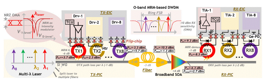 異質(zhì)集成的 DWDM 硅基光電子發(fā)射機集兩家之長:PIC 上的高性能光學組件和 CMOS 電子集成電路 (EIC) 中的先進高速電子組件。這種集成允許使用最合適的制造工藝對每個組件進行優(yōu)化,從而實現(xiàn)卓越的整體性能和可擴展性。