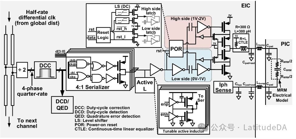 圖 3. 基于堆疊驅(qū)動器的 50-Gbps 電子發(fā)射器的電路實現(xiàn),采用 28-nm CMOS [1]。