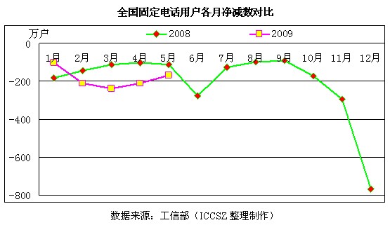 2009年1~5月,全國固定電話用戶減少927.0萬戶(其中無線市話用戶減少800.7萬戶),用戶總數(shù)降至3.32億戶;其中,在前三個(gè)月,固話用戶流失速度不斷加快,從四月份開始,用戶流失速度有所減慢,五月的用戶流失數(shù)進(jìn)一步降低,凈流失量降至167.5萬戶。