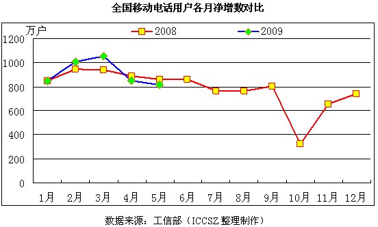移動(dòng)電話用戶方面,2009年1~5月,移動(dòng)電話用戶增加4571.9萬戶,用戶總量達(dá)6.87億戶,其中,在09年的前三個(gè)月,移動(dòng)用戶增長速度不斷加快,四月和五月的用戶增長速度明顯放緩,五月份的凈增量降至814.7萬戶,是09年增長最慢的月份。從09年前五個(gè)月的表現(xiàn)來看,移動(dòng)用戶增長快的月份,固話用戶的流失量也有所增長,這證明了移動(dòng)通信與固話通信明顯的替代效應(yīng)。