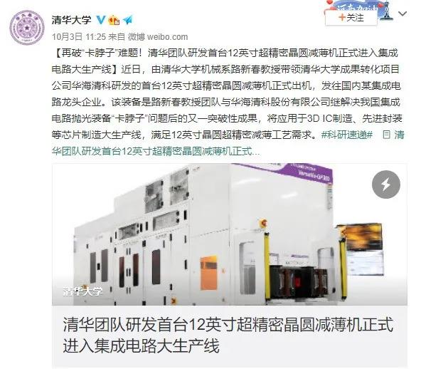 ICC訊 據(jù)清華大學官方消息,近日,由清華大學機械系路新春教授帶領(lǐng)清華大學成果轉(zhuǎn)化項目公司華海清科研發(fā)的首臺12英寸(300mm)超精密晶圓減薄機,已經(jīng)正式出貨,發(fā)往國內(nèi)某集成電路龍頭企業(yè)!