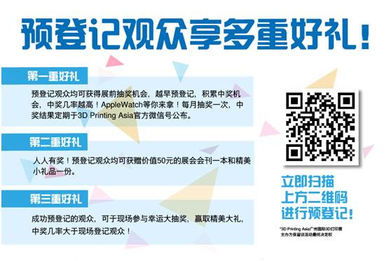 整合·挑戰(zhàn)·第二屆中國3D打印產(chǎn)業(yè)技術(shù)應用峰會期待您的蒞臨,峰會預登記已經(jīng)全面啟動,掃碼填寫即可完成聽眾預登記報名!廣州國際3D打印&模具展期待您參與!