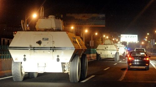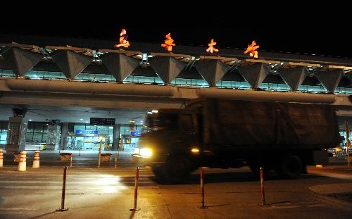 10日凌晨,武警車輛從烏魯木齊地窩堡國(guó)際機(jī)場(chǎng)撤離。