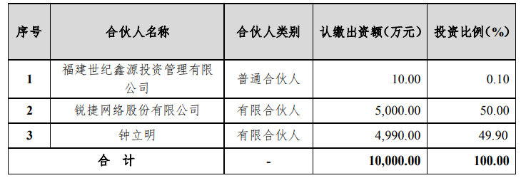 ICC訊 銳捷網(wǎng)絡(luò)公告稱:為推動公司長遠發(fā)展,挖掘產(chǎn)業(yè)鏈上下游的優(yōu)質(zhì)項目,及時把握市場化的投資機會,公司擬作為有限合伙人以自有資金 5,000 萬元人民幣,與福建世紀鑫源投資管理有限公司(以下簡稱“鑫源投資”)、自然人鐘立明共同出資設(shè)立福州市鼓樓區(qū)鑫源福銳創(chuàng)業(yè)投資合伙企業(yè)(有限合伙)(暫定名,最終以工商登記為準,以下簡稱 “產(chǎn)業(yè)基金”)。該基金主要投資于通信、云計算與大數(shù)據(jù)、集成電路、軟件等相關(guān)的新一代信息技術(shù)領(lǐng)域以及產(chǎn)業(yè)上下游優(yōu)質(zhì)創(chuàng)新企業(yè)?;鹂傄?guī)模為 10,000 萬元,基金管理人為鑫源投資。