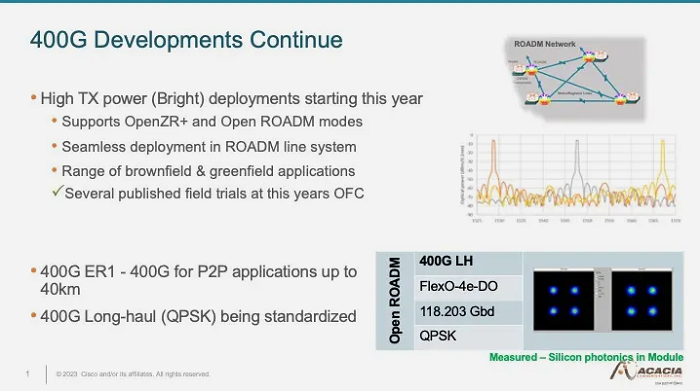 400G的發(fā)展主要集中在三個方面。首先是正在部署的高發(fā)射功率400G ZR+ QSFP-DD可插拔,支持OpenZR+和Open ROADM模式。這些模塊將400G QSFP-DD可插拔的用例擴(kuò)展到城域和區(qū)域ROADM網(wǎng)絡(luò),并增加了傳輸設(shè)備中的Transponder密度。第二種是400G ER1,目標(biāo)是40公里點(diǎn)對點(diǎn)應(yīng)用。第三個領(lǐng)域是400G長途的標(biāo)準(zhǔn)化和發(fā)展。