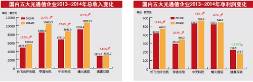 2014年,得益于“寬帶中國”戰(zhàn)略的深入推進,運營商持續(xù)大力發(fā)展4G網(wǎng)絡基礎設施的建設,以及政府提倡的“互聯(lián)網(wǎng)+”行動計劃,國內光纖和光纜的市場需求不斷上升,推動國內光通信企業(yè)整體業(yè)績持續(xù)走高。