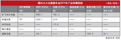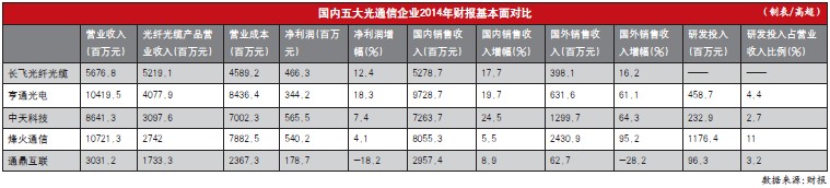據(jù)財報,烽火通信和亨通光電均在2014年取得了超過百億元的營業(yè)收入,分別為107.2億和104.2億元,分別較2013年增長17.7%和21.4%。而中天科技則是行業(yè)內成長較快的企業(yè)之一,2014年營業(yè)收入為86.4億元,同比增長高達27.6%。