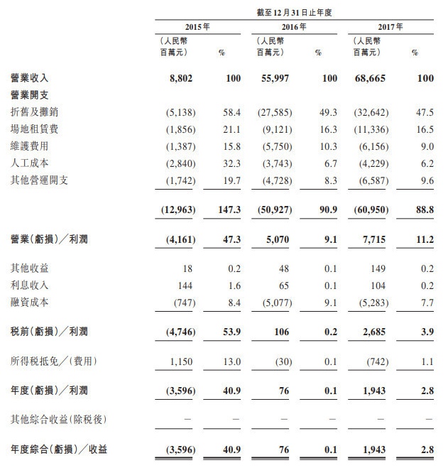 據(jù)招股書顯示,中國鐵塔2017年營收686.65億元,稅前利潤26.85億元;2016年營收559.97億元,稅前利潤1.06億元;2015年營收88.02億元,稅前利潤為-47.46億元。
