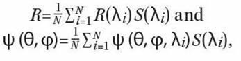 萃取率R跟遠(yuǎn)場(chǎng)的輻射函數(shù)ψ(θ,φ)可以藉由取得每個(gè)波長(zhǎng)相關(guān)的萃取率與輻射函數(shù)后,將LED頻譜加權(quán)平均而得之,如方程式(一)所示: