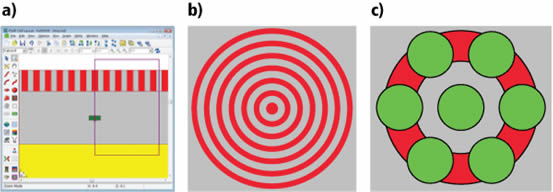 有鑒于此,二維模擬的簡(jiǎn)化需要建筑在「徑向簡(jiǎn)化」上。常被使用的光子晶體表面結(jié)構(gòu),不論是六角柱或是晶格排列,都可視為圓狀的布拉格光柵。布拉格光柵會(huì)在平面方向上產(chǎn)生一個(gè)能隙,迫使電磁場(chǎng)往外傳遞,提高光萃取率。因此,二維的徑向簡(jiǎn)化模擬與實(shí)際問(wèn)題較為符合,如圖6所示。