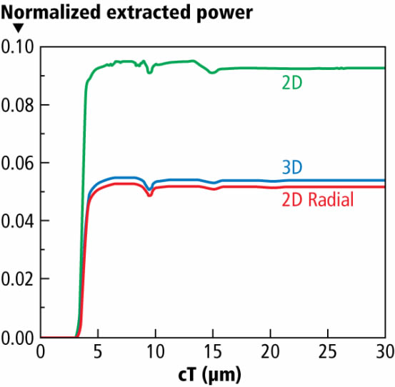 為了確認(rèn)該簡(jiǎn)化假設(shè)是否能成立,三種不同的模擬方法被測(cè)試于平面結(jié)構(gòu)LED之萃取率曲線(xiàn)。分別為:二維線(xiàn)坐標(biāo)簡(jiǎn)化、二維徑向簡(jiǎn)化與三維模擬。如圖7所示,二維徑向(2D Radial)的結(jié)果與三維(3D)模擬結(jié)果吻合,而二維線(xiàn)坐標(biāo)(2D)則如前述,與實(shí)際三維結(jié)果相差甚大。