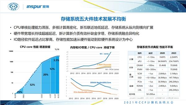 存儲(chǔ)系統(tǒng)的計(jì)算、內(nèi)存、盤介質(zhì)、連接、軟件棧技術(shù)發(fā)展不平衡。CPU單核處理能力滯漲、多核計(jì)算高密化,新互聯(lián)近地低延遲,促進(jìn)存儲(chǔ)系統(tǒng)從縱向到橫向擴(kuò)展;硬件帶寬增長(zhǎng)持續(xù)超越延遲,新計(jì)算新介質(zhì)有效補(bǔ)缺金字塔,未來存儲(chǔ)系統(tǒng)融合異構(gòu)化;IO路徑軟件延遲占比攀高,存儲(chǔ)性能加速從硬件驅(qū)動(dòng)演變到軟硬件系統(tǒng)設(shè)計(jì)為中心等。