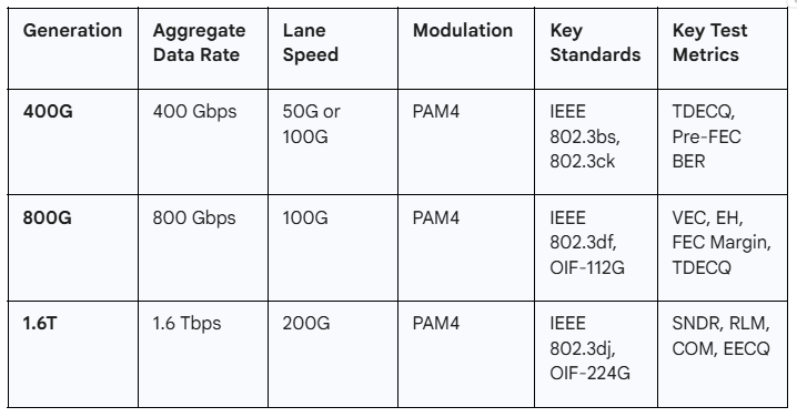 表1:信號(hào)標(biāo)準(zhǔn)的演進(jìn)過程,通道速度從400G系統(tǒng)的50或100 Gigabit發(fā)展到800G的100 Gigabit,再到1.6 Terabit系統(tǒng)的200 Gigabit,以及每代對(duì)應(yīng)的關(guān)鍵測(cè)試指標(biāo)和相關(guān)標(biāo)準(zhǔn)。