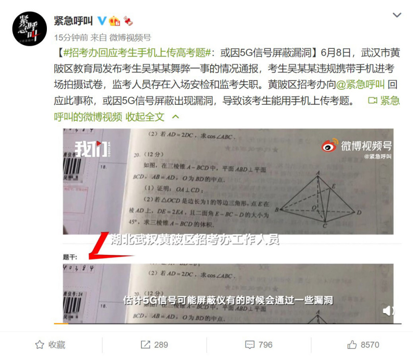 據(jù)新京報(bào)報(bào)道,黃陂區(qū)招考辦向 @緊急呼叫 回應(yīng)此事稱,或因 5G 信號(hào)屏蔽出現(xiàn)漏洞,導(dǎo)致該考生能用手機(jī)上傳考題。