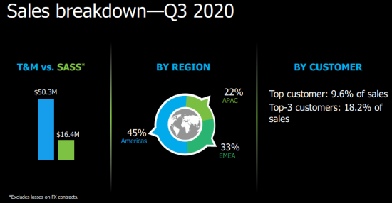 銷售收入:受冠狀病毒大流行的持續(xù)影響,銷售收入同比下降10.1%至6610萬美元。其中,測(cè)試和測(cè)量(T&M)銷售收入占75%,服務(wù)保證、系統(tǒng)和服務(wù)(SASS)銷售收入占25%。三大主要銷售地區(qū)的收入分配分別為:美洲45%、EMEA(歐洲、中東和非洲)33%、亞太22%。EXFO的最大客戶占銷售額的9.6%,前三名客戶占18.2%。