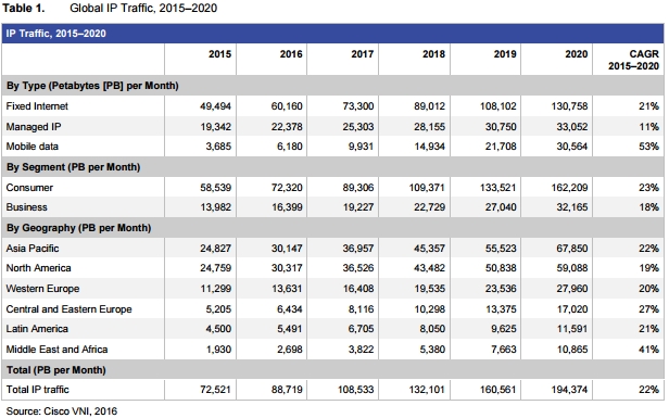 IP流量將從2015年的每月72.5EB增長(zhǎng)至2020年的每月194.4EB。