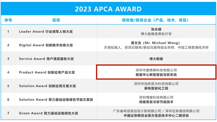 本屆2023”APCA AWARD”大獎(jiǎng),愛(ài)德泰憑借基于RFID技術(shù)開(kāi)發(fā)的”數(shù)據(jù)中心新型智能互聯(lián)管理系統(tǒng)”以卓越的產(chǎn)品實(shí)力榮膺2023 APCA AWARD Product Award(創(chuàng)新產(chǎn)品應(yīng)用獎(jiǎng))