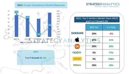 摘要:市場(chǎng)研究機(jī)構(gòu)Strategy Analytics發(fā)布的報(bào)告數(shù)據(jù)顯示,2021年全年,排名歐洲智能手機(jī)出貨量和市場(chǎng)份額前五的廠(chǎng)商分別為:三星、蘋(píng)果、小米、OPPO、realme。